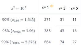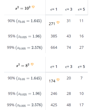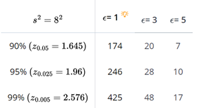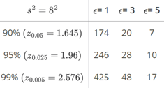 we can also change the estimate of the variance. For example, if we change the sample variance to \(s^2=8^2\), then the necessary sample sizes for various errors ϵ and confidence levels (1− α) become: