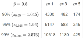 By the way, just as we did for the case in which the sample proportion was 0.8, we can change the factors to see what the “cost” is in sample size for achieving certain errors \(\epsilon\) and confidence levels \((1 - \alpha)\). Doing that here, we get: