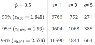 \[ n = \frac{z^2_{(\alpha/2)} (\hat{p}(1-\hat{p}))}{\epsilon^2} \]