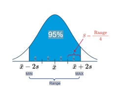 That is, we could define the range of values as that which captures 95% of the measurements. If we do that, then we can work backwards to see that \(s\) can be determined by dividing the range by 4. That is: \[ s = \frac{\text{Range}}{4} = \frac{\text{Max} - \text{Min}}{4} \]