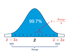 In this case, we could define the range of values as that which captures 99.7% of the measurements. If we do that, then we can work backwards to see that \(s\) can be determined by dividing the range by 6. That is: \[ s = \frac{\text{Range}}{6} = \frac{\text{Max} - \text{Min}}{6} \]